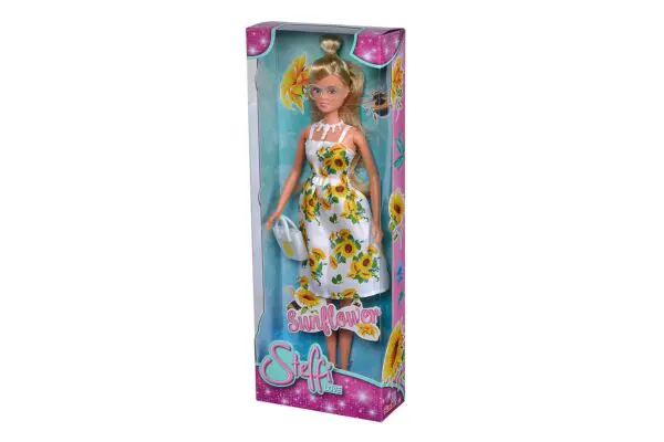 הבובה מגיעה עם שמלת חמניות, משקפי שמש, שרשרת ותיק יד
