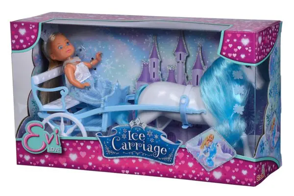 אווי רוכבת על כרכרת קרח מפוארת הכוללת סוס לבן צחור עם שיער תכלת ארוך
